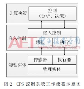 如图2所示,CPS是一种虚(信息空间)实(物理空间)深度融合的智能控制系统。利用嵌入式软件,从被控对象(传感器、仪器、仪表、在线测量设备等)和被控环境中采集信息,实现感知功能,通过上层的计算功能分析被控对象和环境的当前状况,最后再根据已建立的模型计算和控制规则形成决策结果,向执行器发出操作指令。在具体的应用中,以上过程是一个“感知→分析→决策→执行→”的循环往复过程,直到实现既定的控制目标。另外,一般由多个可控的物理实体根据生产流程构成一个具体的生产系统,不同物理实体的集成和控制需要通过信息空间中的通信网络或CPS总线来实现。