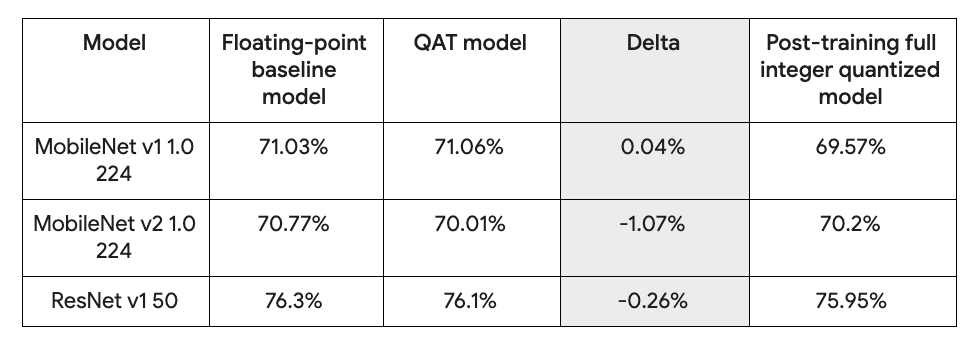 上表中,通过 TensorFlow Lite 默认配置训练得出 QAT 准确率,并与浮点基准和训练后量化模型进行了对比。