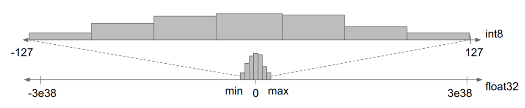 小范围的 float32 值映射到 int8 是有损转换,因为 int8 只有 255 个信息通道