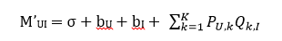 即对于矩阵M(m*n),我们想办法将其分解为P(m*k)、Q(k*n),此时对于原始矩阵中有评分的位置MUI来说,其在分解后矩阵中对应的值就是
