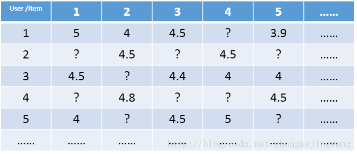 上图即为评分矩阵的一个例子。其中的?表示用户还没有对物品做出评价,而推荐系统最终的目标就是对于任意一个用户,预测出所有未评分物品的分值,并按分值从高到低的顺序将对应的物品推荐给用户。