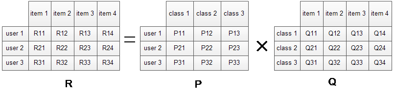 对于原始评分矩阵R,我们假定一共有三类隐含特征,于是将矩阵R(3*4)分解成用户特征矩阵P(3*3)与物品特征矩阵Q(3*4)。考察user1对item1的评分,可以认为user1对三类隐含特征class1、class2、class3的感兴趣程度分别为P11、P12、P13,而这三类隐含特征与item1相关程度则分别为Q11、Q21、Q31。