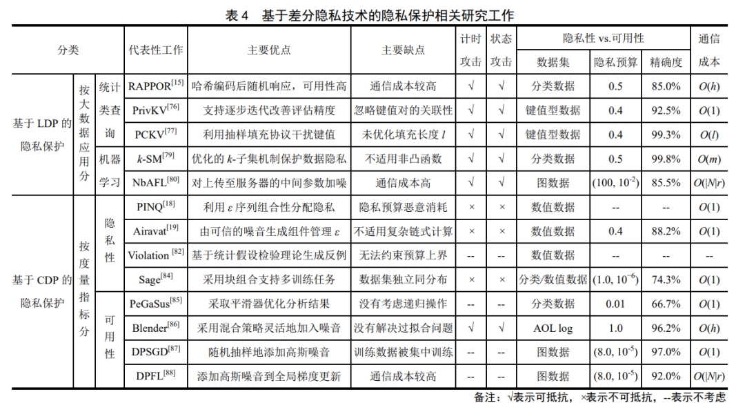 (2)研究针对复杂数据类型的高可用差分隐 私保护:目前,大部分研究工作重点关注简单数据 类型的差分隐私保护,例如针对离散分类数据的本 地化差分隐私地频率估计以及针对连续数值数据 的本地化差分隐私地均值估计。而对于大数据计算 中的半结构化或者非结构化数据研究较少,例如键 值型数据或者图数据等复杂数据类型。在实际应用 中,参与大数据计算的主要是这些复杂数据类型。另外,现有方案对键值数据进行扰动时忽略了键与 值之间的对应关系[76],一方面将造成隐私泄露降低 隐私性,另一方面将导致过多的噪音被添加,影响 了可用性。因此,在实际应用场景下,权衡复杂数 据类型扰动的隐私性和可用性,设计出高可用的差 分隐私保护是未来这一类研究方向的重点。