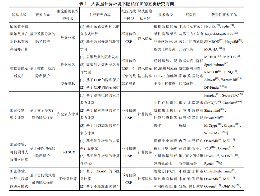本文对大数据计算环境下的隐私保护技术研 究进展进行了综述。首先分析了大数据计算环境下 的敌手模型、隐私问题与挑战,以及隐私保护的研 究方向;接着,根据隐私保护技术的不同,分别总 结分析了基于数据分离的隐私保护、基于数据干扰 的隐私保护、基于安全多方计算的隐私保护、基于 硬件增强的隐私保护、以及基于访问模式隐藏的隐 私保护等研究方向的最新研究进展,并对比分析了 不同隐私保护技术的优缺点;最后,展望了大数据 计算环境下隐私保护技术的未来研究方向。期望本 文的工作,能给以后的研究者提供有益的参考与借 鉴,为大数据隐私保护的进一步发展做出贡献。综合分析可知,不同隐私保护技术具有不同的 技术特点、局限性和适用场景。在大数据计算环境 下应用隐私保护技术时,数据分离和匿名技术侧重 于在数据输入阶段保护原始数据的敏感信息,其中 数据分离技术主要存在通信开销较高的局限性,适 用于本地或私有云环境具有较强算力的隐私保护 场景,匿名技术实现简单但是主要面临着更强背景 知识攻击的困扰;差分隐私技术侧重于在数据输入 和结果输出阶段扰动数据,在实际应用中计算效率 较高,但是主要存在可用性不高的局限性,适用于 计算节点算力较弱且对隐私保护水平有一定要求 的场景;安全多方计算、Intel SGX 和不经意计算等 技术侧重于在数据计算过程中保护数据的隐私性 和计算的安全性,在实际应用中,安全多方计算主 要存在通信开销较高和执行效率较低的局限性,适 用于多方分布式联合计算的隐私保护场景;Intel SGX 技术需要可信硬件辅助以在安全隔离环境下 执行明文计算,在应用中主要面临侧信道攻击的安 全威胁;不经意计算主要依赖 ORAM 或不经意混 洗手段隐藏访问模式,但是这些手段本身存在低效 性和特殊性,特别是 ORAM 在实际应用中带来了 较高的计算复杂度。因此,未来在大数据计算环境 下应用这些隐私保护技术,仍然存在很多问题需要 亟待解决,其中以下五个问题值得进一步地研究。