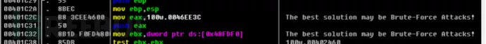 找这个函数地址的思路有两个。一个,由于这个crackme是用易语言写的,所以用e-debug可以找到call的地址: