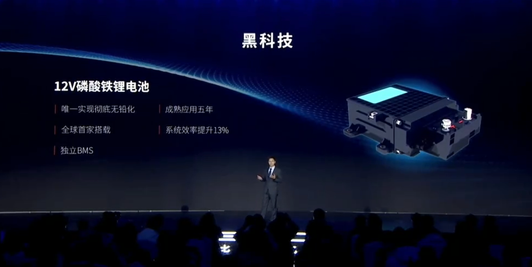 我们再把目光转到比亚迪这边。作为一个把科技树点在磷酸铁锂上的企业,比亚迪很多年前就发布了 12V 磷酸铁锂电池,并在早期的 DM 混动车型上运用过。在发布 DM-i 系统时,比亚迪顺带发布了第三代 12V 磷酸铁锂电池,它延续了高压动力电池的设计思路,将 BMS 整合到电池内部,它具备长于铅酸电池的寿命,降低了用户的维护成本。