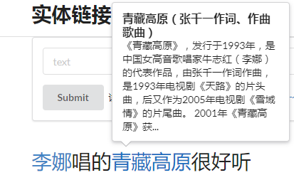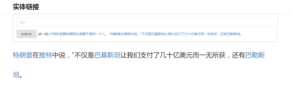 在输入框输入文本,输出经过实体识别与链接后的文本,其中被识别的实体会链接到CN-DBpedia知识库中。如图4所示。