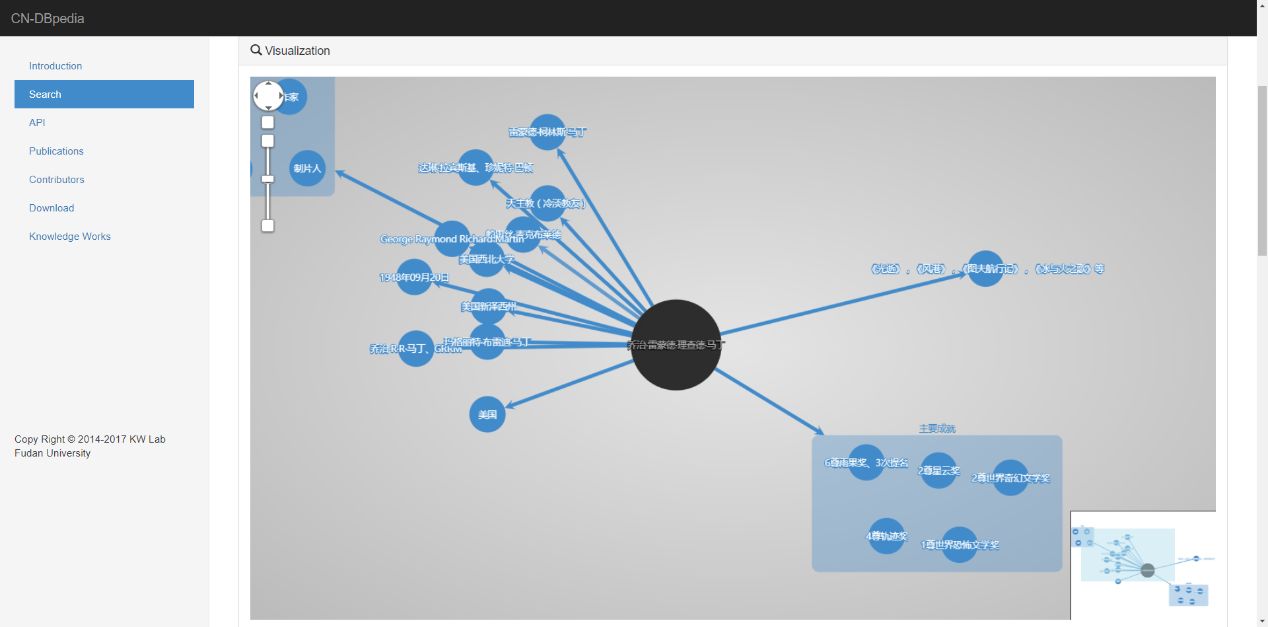 信息抽取的一个重要任务就是关系抽取。知识图谱中除了实体之外,还有许多关系和属性。CN-DBpedia中的关系如图3所示,这样的关系通常是不完整的,需要从大量的自由文本中抽取。比如,若需要从文本“乔治.马丁写了冰与火之歌”中抽取关系,第一步则是将“乔治.马丁”和“冰与火之歌”从文本中识别并分别链接到正确的人和书名之中,然后才能根据其余文本抽取出<乔治•雷蒙德•理查德•马丁,作者,冰与火之歌(乔治•r•r•马丁所著小说)>这样的关系。