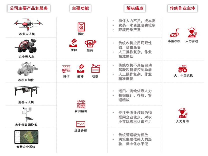 极飞已经是一家农业科技公司。对比大疆农业无人机而言,极飞的产品线更全。已经从农业无人机拓展到农业全产业链,包括农业无人车、农业自驾仪、遥感无人机、农业物联网、智慧农业系统。也就是说,极飞的目标不是农业无人机,而是农业这块难啃的骨头。