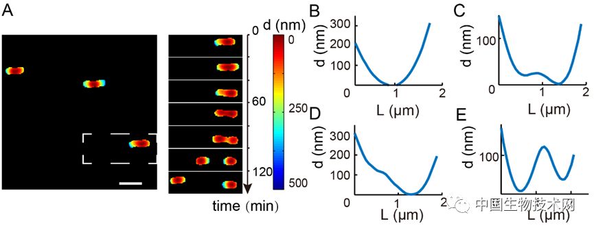 鉴于对以上问题的疑问,中国科学院深圳先进技术研究院金帆课题组自主研发了一台暗场全内反射显微镜(p-TIRDFM),p-TIRDFM依靠消逝波远离表面时的指数衰减特性可以敏感地检测到距离变化。研究者将p-TIRDFM成像技术与微流控技术结合,成功地观察到了铜绿假单胞菌粘附到表面后的“躺姿”:细菌初始粘附到表面是采用身体中部的一个接触点“点躺”在表面上的,而身体的两个极端部位有相对于接触点200 nm的距离;伴随着细菌在表面上分裂,细菌的单个接触点也会逐渐地分离并最终分裂成两个,以分配给自己的两个子代(如下图所示)。研究者通过进一步的定量分析首次建立了细菌离表面的距离与蹭行运动的关系:蹭行运动快的细菌,其离表面的距离相对较远,并且波动很大,而运动慢的细菌其距离则较近,并且波动小。此项研究结果不仅提供了用p-TIRDFM研究细菌表面行为的范例,也加深了我们理解生物被膜形成过程中细菌不同表面行为之间的联系。