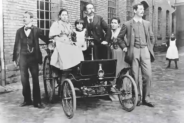 卡尔·本茨「左四」及家人在工厂与奔驰汽车合影
