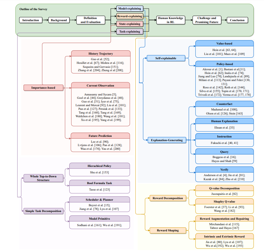 图1所示概述。本文概述了可解释强化学习(XRL)。在我们的工作中,我们根据强化学习(RL)过程中不同部分的可解释性将XRL分为四个部分:模型、奖励、状态和任务。这张图用不同的颜色表示。图中还展示了更具体的分类和作品,我们将在后面的部分中讨论它们。