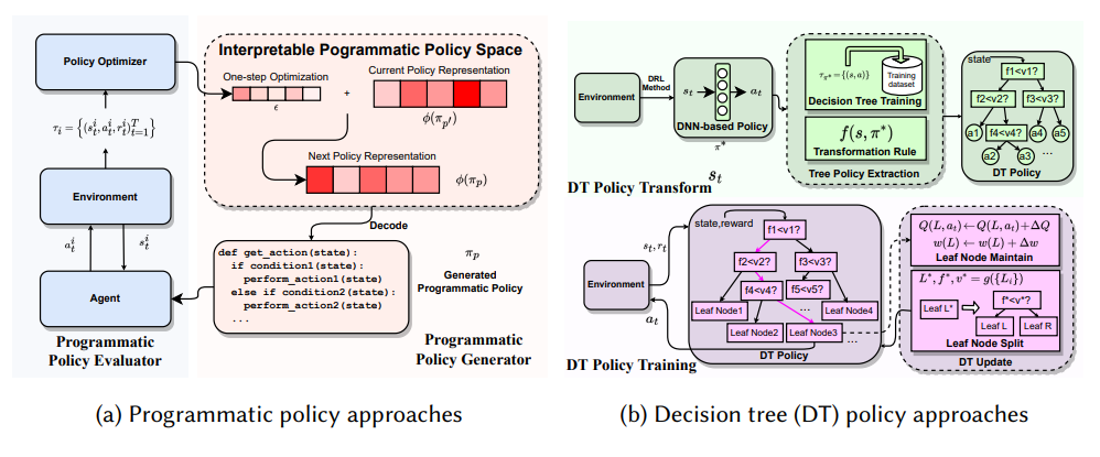 强化学习[193]受到人类试错范式的启发[143]。它基于这样一个事实:与环境互动是人类在没有他人指导的情况下学习的常见方式[98]。从互动中,人类获得了关于因果关系、行动结果以及如何在环境中实现目标的信息。这类信息被隐式地用来构建我们的心智模型[155,218,225],而更多这类信息将使这个心智模型更加精确[22,171]。RL类似于目标导向的学习,通过与环境的交互,敏锐地意识到环境如何响应我们的行为,并有目的地影响未来的事件。更准确地说,RL学会从环境状态映射到行动,从而最大化数值奖励信号[189]。近年来,深度学习的快速发展[15,194]促进了深度学习与强化学习的融合。因此,深度强化学习(DRL)[44, 60, 134, 135, 177]作为一种新的RL范式出现。凭借深度神经网络强大的表示能力[7,51,230],DRL在许多领域都取得了相当的性能[17,24,29,37,11,121,184],特别是在AlphaZero[184]和OpenAI Five[17]等游戏任务中,基于DRL的方法成功击败了人类职业选手。然而,对于现实场景中更复杂的任务,如自动驾驶[25,39,79,213,214]和电力系统调度[109,115,226,227,239],不仅要考虑高性能,还要考虑面向用户的可解释性,以考虑安全性和可靠性。这种可解释性的要求是在真实世界而不是模拟环境中使用DRL的主要瓶颈。