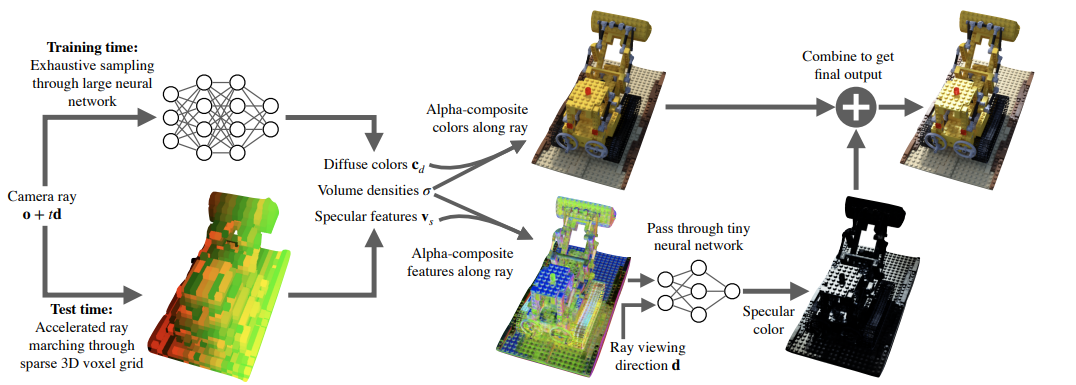 最近有研究将NeRF烘焙(baking)到稀疏的3D voxel grid中来解决这个问题,比如SNeRG中的每个激活的voxel包含不透明度、漫反射颜色和学习的特征向量。