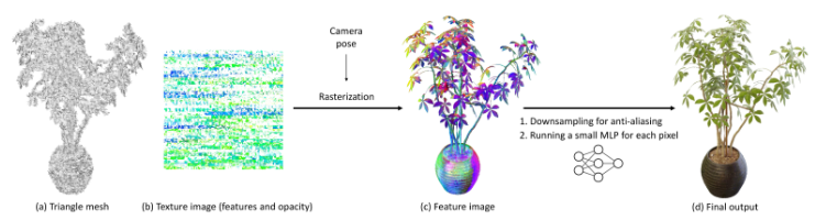 训练阶段3:提取一个稀疏的多边形网格,将不透明度和特征烘焙成纹理图,并存储神经递延着色器的权重。网格被存储为OBJ文件,纹理图被存储为PNG文件,而延迟着色器的权重则被存储在一个(小型)JSON文件中。