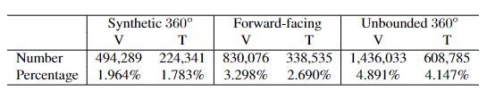 在多边形的计数中,可以看到MobileNeRF对每个场景产生的顶点和三角形的平均数量,以及与初始网格中所有可用顶点/三角形相比的百分比。由于MobileNeRF只保留了可见的三角形,所以在最终的网格中大部分顶点/三角形被移除。