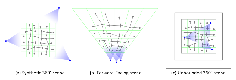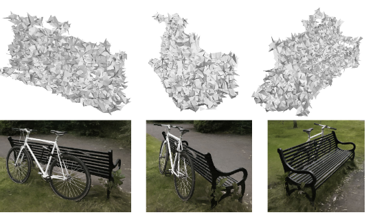 NeRF由一组纹理多边形(textured polygons)表示,其中多边形大致沿着场景表面排布,纹理图集存储不透明度和特征向量。