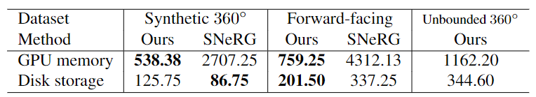 在测试时,GPU内存消耗和存储成本相比SNeRG来说也降低了很多。