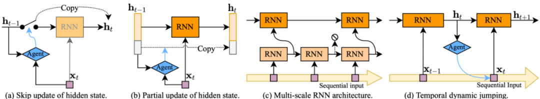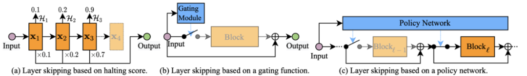 「早退」机制相当于跳过了某一分类器之后所有层的运算。第二类具有动态深度的网络则更加灵活:针对每个输入样本,自适应地决定网络的每个中间层是否执行。根据决策方式,动态「跳层」主要有三种实现(如下图 4 所示):基于 halting score[9]、基于门函数 [36] 和基于策略网络[37]。