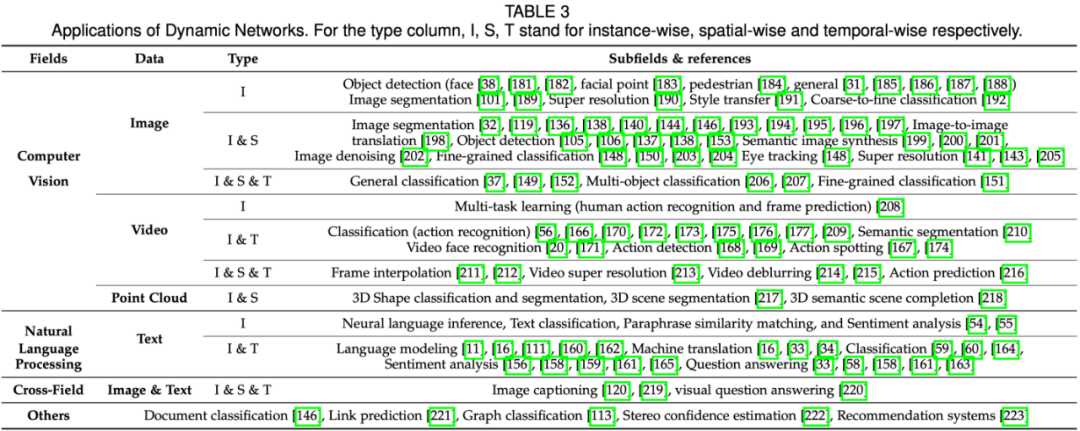 根据输入模态,研究者总结了动态网络在领域中的应用情况以及相对应的自适应推理类型,如下表所示: