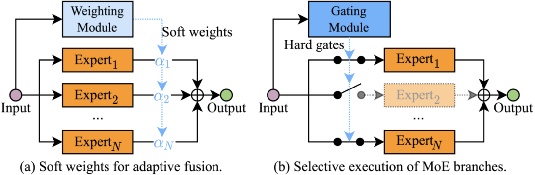 建立多个「专家」(可以是完整模型或者网络模块),并对这些「专家」的输出结果进行动态加权来得到最终预测。早期的相关工作往往对这些结果进行「软」加权(如下图 5 (a) 所示)来提升模型的表征能力[39],[40]。然而,网络的运算量随着「专家」个数线性增长,带来了大量的冗余计算。因此,近期的一些研究通过控制门(gates)来选择性地激活这些「专家」子网络,从而实现模型效率的提升(见图 5 (b))。