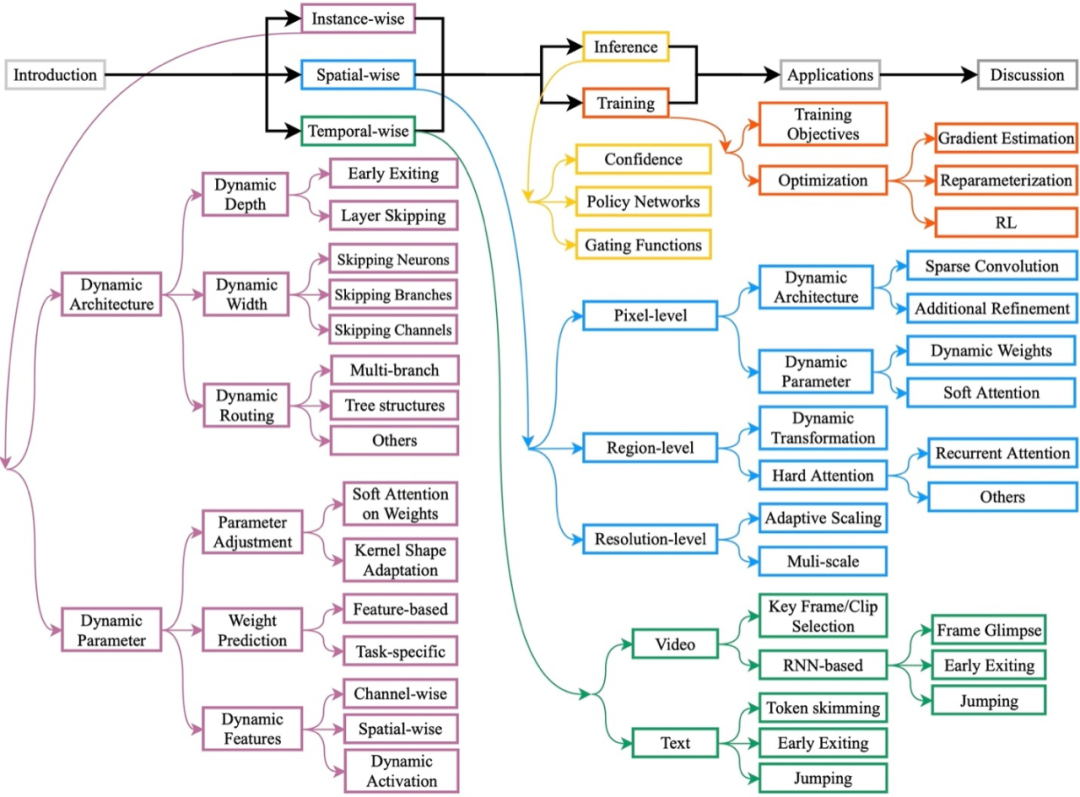 动态网络:模型能够针对不同输入样本,自适应地调节其结构或参数。第 3、4 章中分别介绍了两种更细粒度的动态模型: