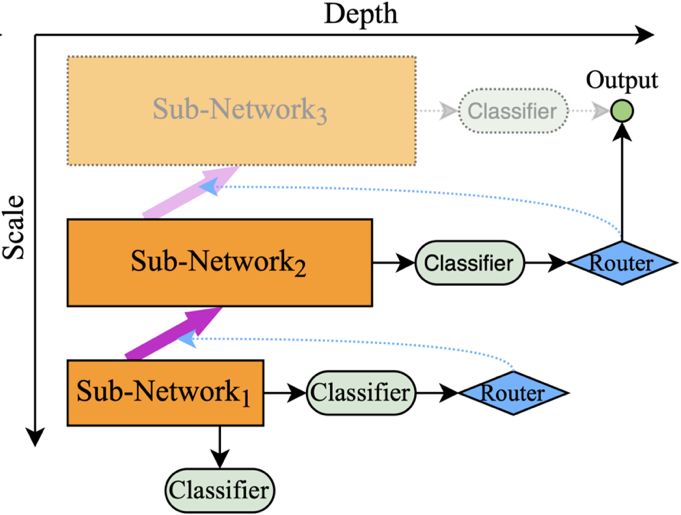 区别于之前工作中基于已有链式结构或多尺度架构进行网络层的动态执行,有一部分工作建立更加通用的超网络,并在超网络内部的(部分)节点,采用一定的路由机制来对到达该网络的样本特征进行动态路由。对于第