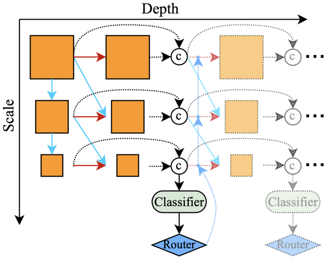 值得一提的是,有研究表明如果在链式结构的 CNN 中添加中间出口,则这些出口会干扰彼此的性能 [10]。为了解决这一问题,多尺度密集连接网络 (MSDNet, 见下图 3) 采用了多尺度特征以及密集连接 (dense connections) , 有效地提升了多个分类器的协同训练效果。