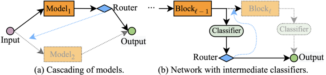 。顾名思义,「早退」机制的核心思想是:在模型中间层设置出口,并根据每个样本在这些中间出口处的输出,自适应地决定该样本是否「早退」。不同的工作设计了不同的网络结构来实现这样的「早退」,包括将多个模型串联 [34]、在单个 backbone 中间层添加分类器[35] 等(如下图 2 所示)。