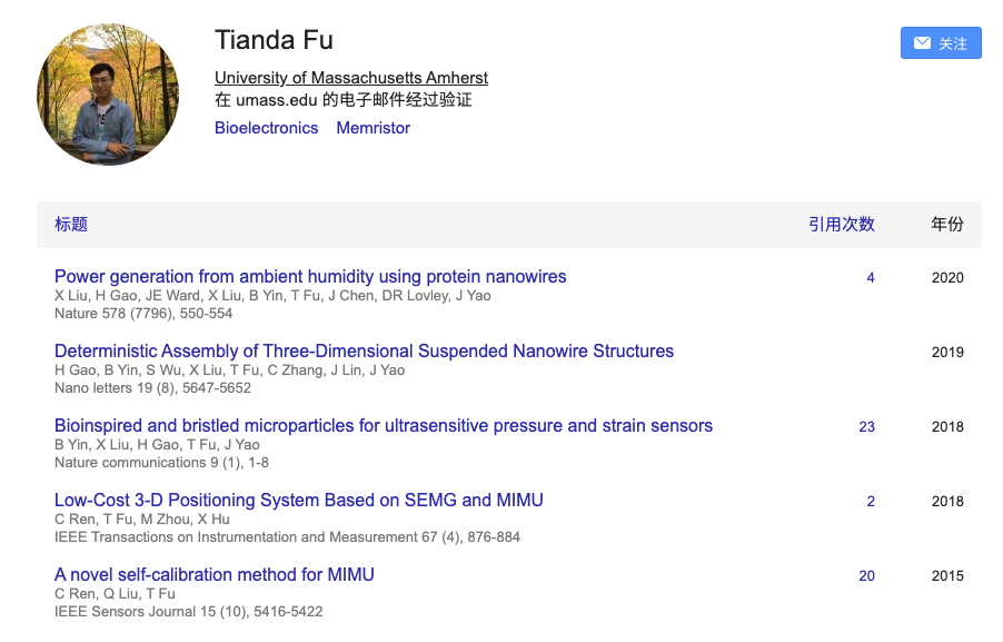 根据Google学术,他的研究方向是生物电子以及忆阻器。算上本次发布的论文,共计发表论文6篇,其中2020年有2篇发布在Nature上,一篇发布在Nature communications。