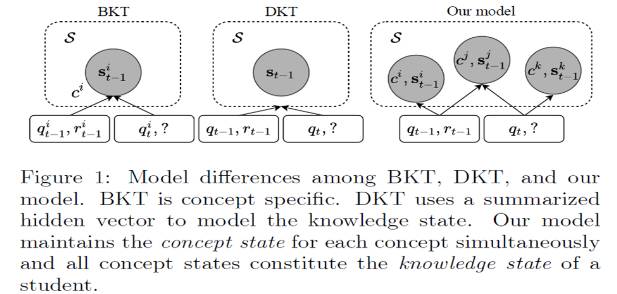 BKT 对每个概念(技能)建模,无法抓住不同概念之间的联系;并且概念需要预定义,对复杂概念状态的建模能力差。