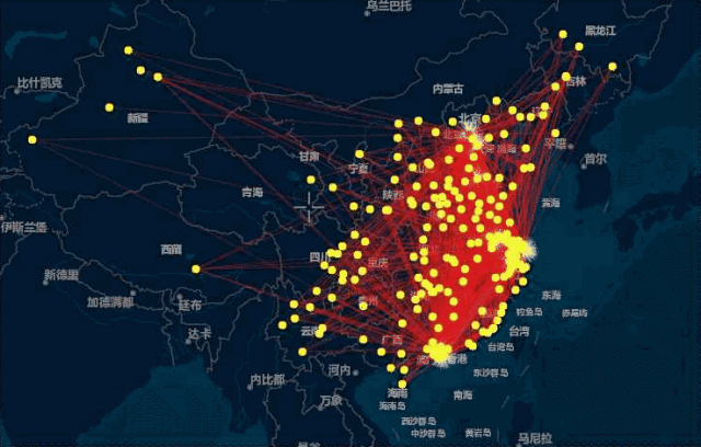 由于虎嗅网上的文章大多涉及创业、政策、商业方面的内容,因而这种城市之间的共现关系反映出城际间在资源、人员或者行业方面的关联关系,本动态图中,主要反映的是北上广深杭(网络中的枢纽节点)之间的相互流动关系和这几个一线城市向中西部城市的单向流动情形。流动量大、交错密集的区域无疑是中国最发达的3个城市群和其他几个新兴的城市群: