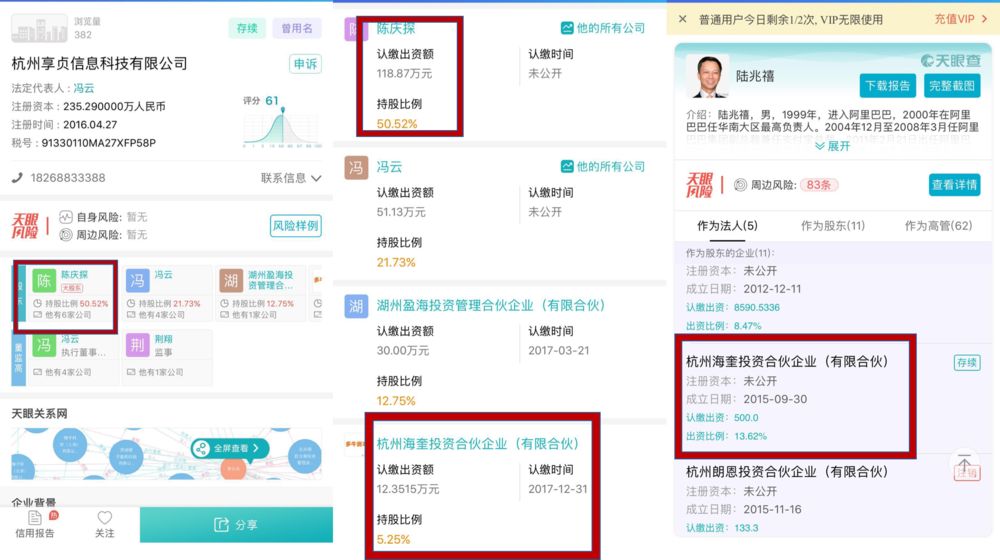 融资线索已在工商信息部分呈现。据天眼查显示,新公司杭州享贞信息科技有限公司注册时间为2016年4月27日,陈庆探为大股东,持股比例50.62%。