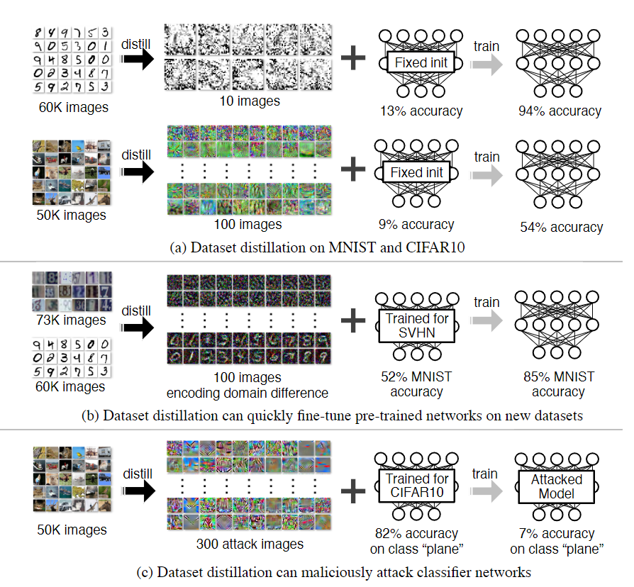 除模型的直接表示外,另外也有工作试图通过样本在模型训练中间的表现,用来衡量样本的模式,例如样本的遗忘事件,样本对模型更新参数的贡献等(具体参见往期推文:我删了这些训练数据…模型反而表现更好了!?)。另外就是数据集蒸馏,也就是将大规模的数据蒸馏到小规模的人工数据上。