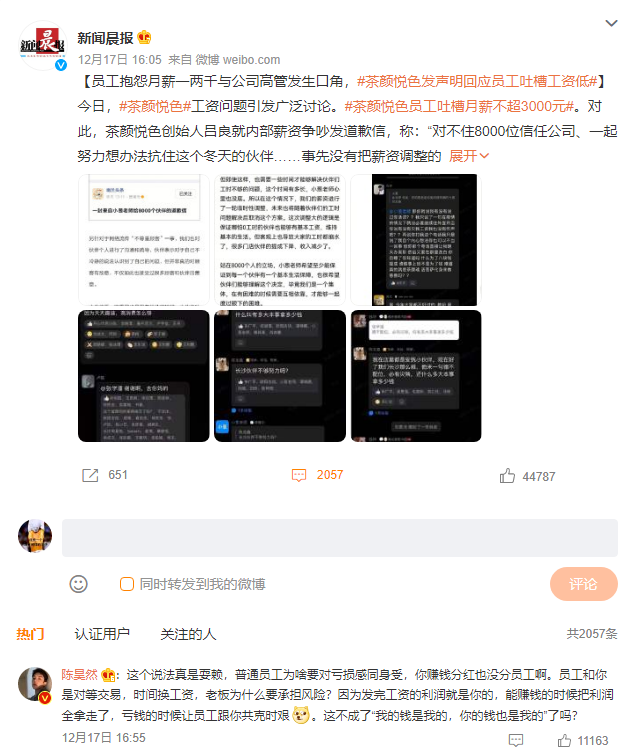 紧接着有茶颜悦色员工在微博、小红书上等爆料,称公司员工人均工时11小时,时薪6-9元钱,月薪到手不满3000。