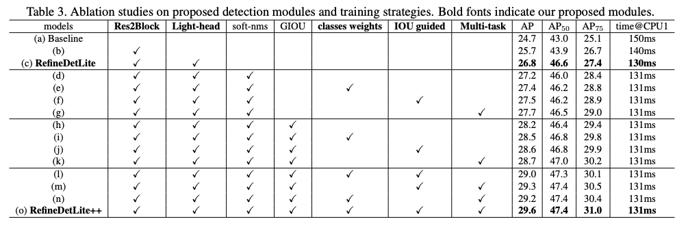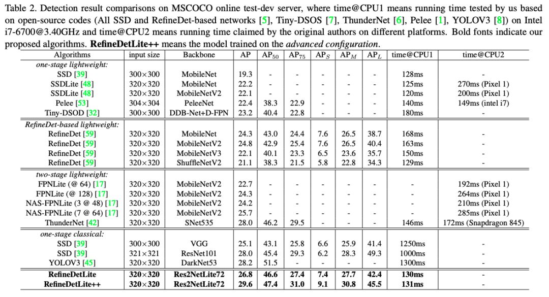 1. RefineDetLite 达到了 AP 26.8,加上作者提出的训练策略,可以达到29.6,在轻量级目标检测网络中是最高的精度。