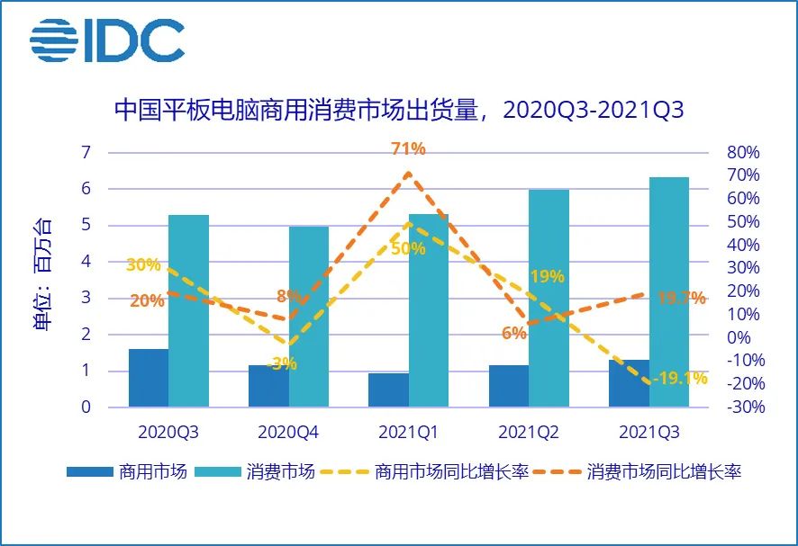 根据IDC发布的最新数据,2021 年第三季度,中国平板电脑市场出货量约 765 万台,同比增长 10.6%,再创近 7 年单季度出货量新高。其中消费市场出货约 632 万台,同比增长 19.7%。商用市场出货量约 131 万台,同比下降 19.1%。与此同时,全球平板电脑市场自 “新冠疫情” 爆发以后,首次出现出货同比下降 9.3%,总出货量约为 4241 万台。