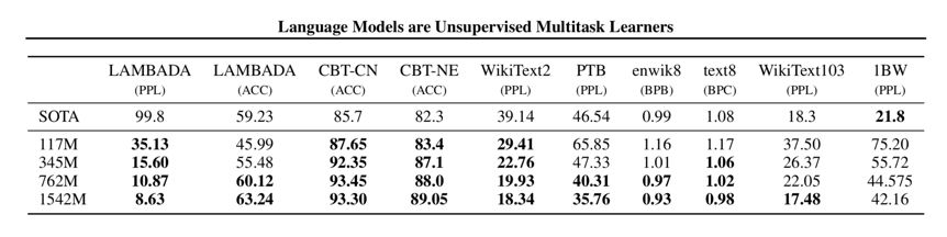 除了这个案例,GPT-2 更是一举刷新了多个语言模型任务的新记录!表1列举了 GPT-2 的战果,总共8个任务拿下7个最佳,而且在某些任务上将此前最佳甩开了好几个身位。表中,117M、245M、762M、和1542M表示同样方法不同参数量的 GPT-2 模型。