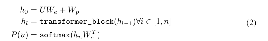 在公式2中,h0 表示网络第一个隐层,U 表示输入序列,We 表示 token embedding 矩阵,Wp 表示 position embedding。h1 到 hn 是各层 Transformer block 的输出隐层。最终以 sotfmax 计算下一个词的概率。