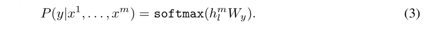 在 Fine-Tune 阶段,输入的样本是(序列 x1...xm,标签 y)。给定一个序列,预测标签的概率如公式3所示。