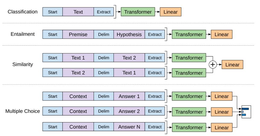 但你可能又要说了,输入一个长长的序列,却只能得到一个单标签 y,能解决的下游任务岂不非常有限。不是,通过对输入序列进行重构,GPT 能够解决很多问题。图2描述了对于不同类型的任务如何去做输入重构,可以看出,它既可以解决分类这样单序列输入的问题,又可以解决像 QA 这样多个序列输入的问题。其中蓝色部分是特殊 token。