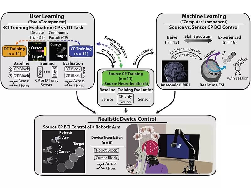 而在本文介绍的新研究中,研究人员们建立了一个新的框架,采用一种人机相互适应的训练方式,通过定向提高脑机接口的用户学习和机器学习能力,改进脑机接口的“大脑”和“计算机”部分,并通过脑电图(EEG)源成像提高非侵入式神经数据的空间分辨率。