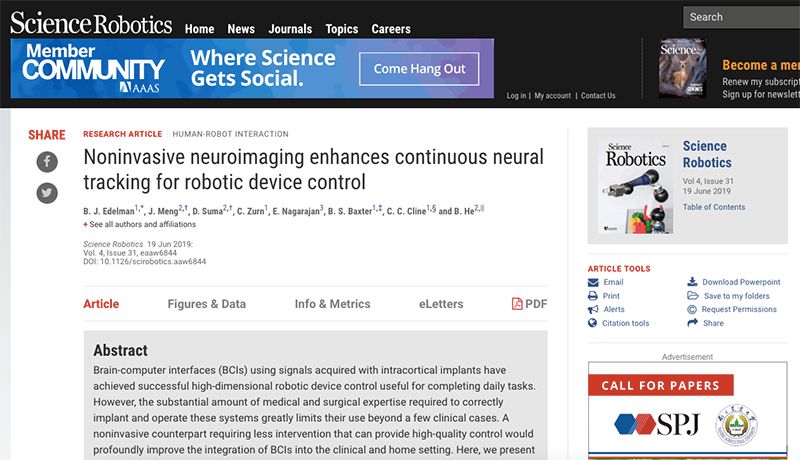 这一研究成果已于美国时间2019年6月19日发表在机器人顶级期刊《Science Robotics》上,名为《用于机器人设备控制的非侵入式神经成像增强连续神经追踪(Noninvasive neuroimaging enhances continuous neural tracking for robotic device control)》。