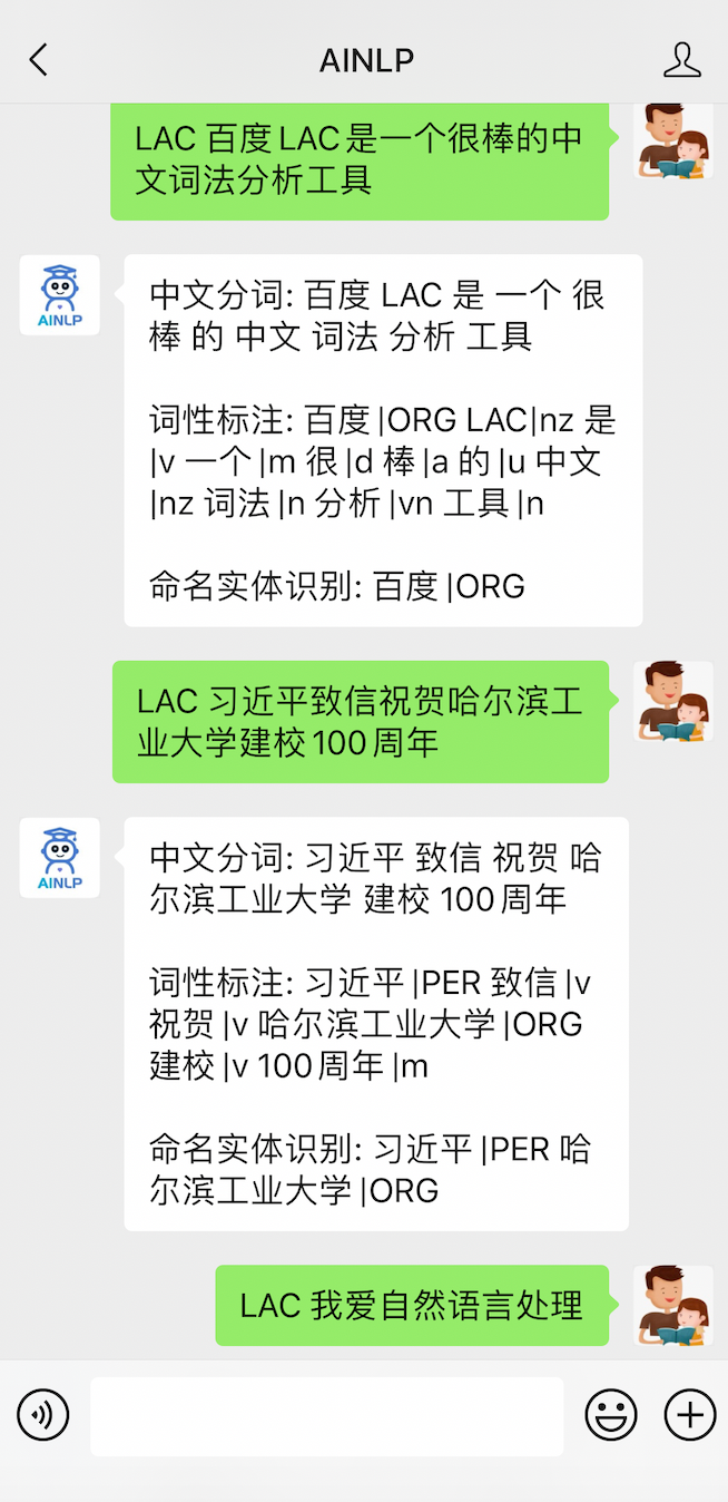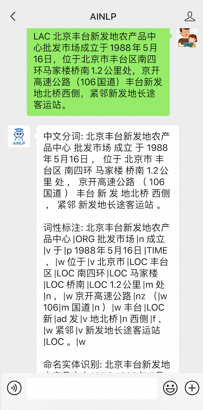 关于中文词法分析(中文分词、词性标注、命名实体识别)相关的工具,我们在之前已经多次提到过百度LAC(https://github.com/baidu/lac),除了在易用性上稍弱外,其他方面,特别在专名识别的横向对比中还是很亮眼的。最近百度NLP发布了LAC 2.0:开源!我知道你不知道,百度开源词法LAC 2.0帮你更懂中文,看完文章的第一感受就是易用性大大加强了,之前需要通过PaddleNLP或者PaddleHub调用lac,现在 "pip install lac" 后即可直接调用,相当方便。所以花了一点时间,把 LAC 2.0 单独作为一个接口部署在AINLP公众号的自然语言处理工具测试平台了,感兴趣的同学可以通过AINLP公众号后台对话极速体验LAC 2.0,输入"LAC 中文文本"直接获取百度LAC的中文文词、词性标注、NER识别结果: