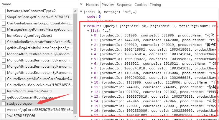 虽说动态网站数据请求也有GET方法的,但小编发现POST方法才是动态网页的主要的请求方式。受杜老师小魔方文章启发,小编也试一下这个网页上的效果。登录网易云课堂账号,右键开发者工具,直接定位到XHR,查找课程数据属于哪个url。通过尝试和preview,可以发现课程信息都被封装在一个studycourse.json的文件中: