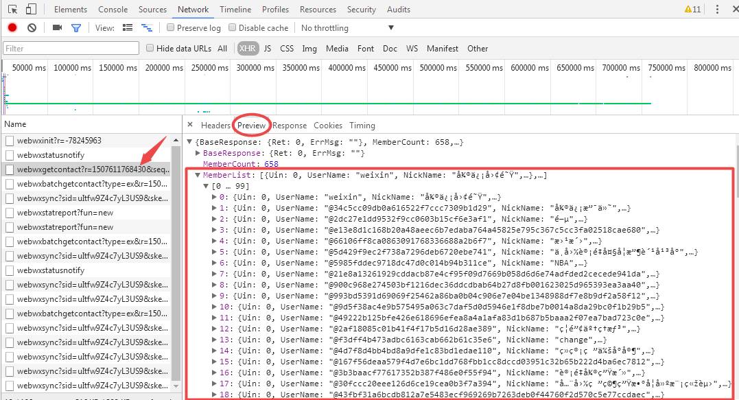 简单找一下发现网页中的微信好友列表信息并没有呈现在HTML 中,大概可以断定微信好友数据是通过动态加载来显示的,所以直接定位到XHR中,经过几番尝试,结合右侧的preview,我们会发现大量整齐划一的数据,所以二次请求的url真的就是它了: