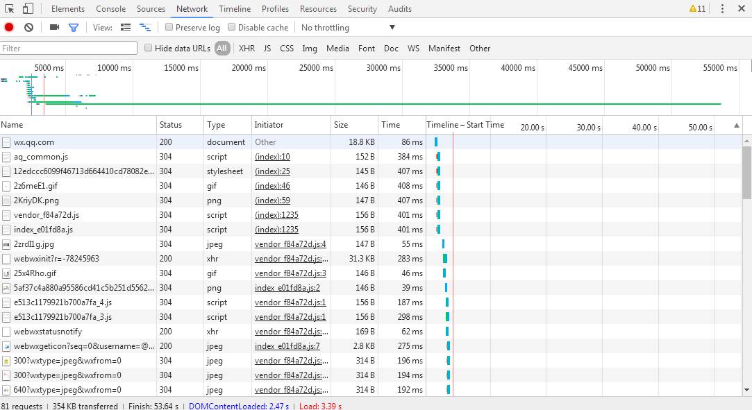 很早之前圈子里就看到过用Python抓取自己微信好友数据的案例分享,今天便以微信网页版为例,探一探其网页结构。首先登录个人微信网页版,右键打开web开发者工具,下来一大堆请求: