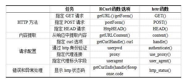 所谓动态网页和异步加载,在之前的系列4的时候小编已通过AJAX介绍过了,简单而言就是我明明在网页中看到了这个数据,但到后台HTML中却找不到了,这通常就是XHR在作祟。这时候我们就不要看原始的HTML数据了,需要进行二次请求,通过web开发者工具找到真实请求的url。下面小编就以两个网页为例,分别通过GET和POST请求拿到动态网页数据,全过程主要使用httr包来实现,httr包可谓是RCurl包的精简版,说其短小精悍也不为过。httr包与RCurl包在主要函数的区别如下所示: