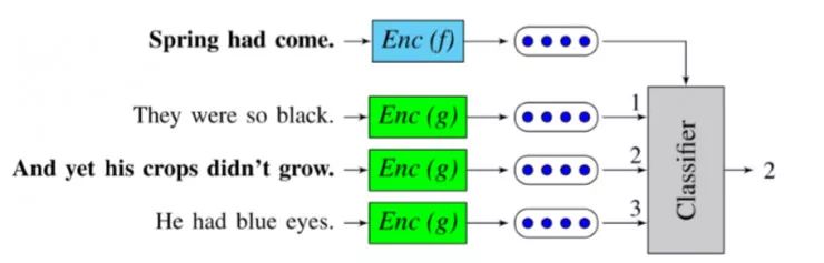 Quick-thoughts分类任务, 分类器必须从一组句子嵌入中选择以下句子