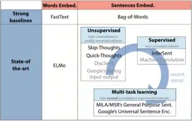 虽然句子的无监督表示学习已经成为很长一段时间的规范,但最近几个月,随着 2017年末、 2018 年初提出了一些非常有趣的提议,无监督学习已经有转向有监督和多任务学习方案的趋势。